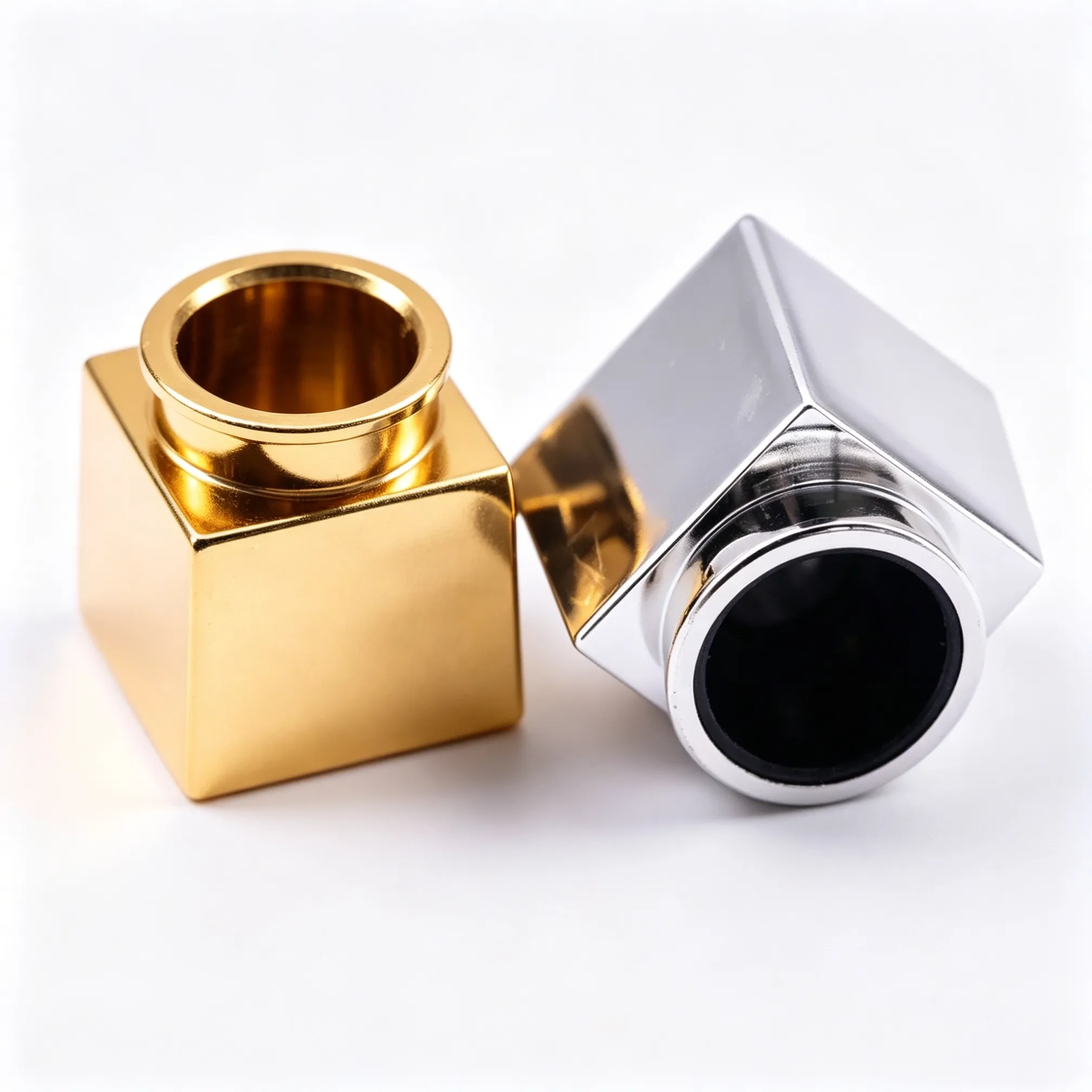 Upgrade your fragrance packaging with our square zinc alloy perfume cap, designed for modern perfume brands seeking a luxury, minimalist aesthetic. Featuring a matte black finish and straight inner core (non-threaded), this cap is widely used in premium fragrance lines across global markets.