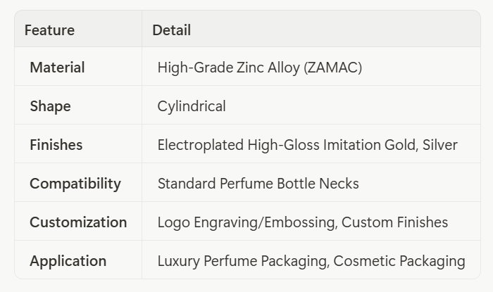 The classic cylindrical shape of our perfume caps offers unparalleled versatility. It provides a clean, uncluttered look that integrates seamlessly with various bottle silhouettes. The smooth, polished surface is also an excellent canvas for custom branding, allowing for discreet laser engraving or embossing of your logo to reinforce brand identity.